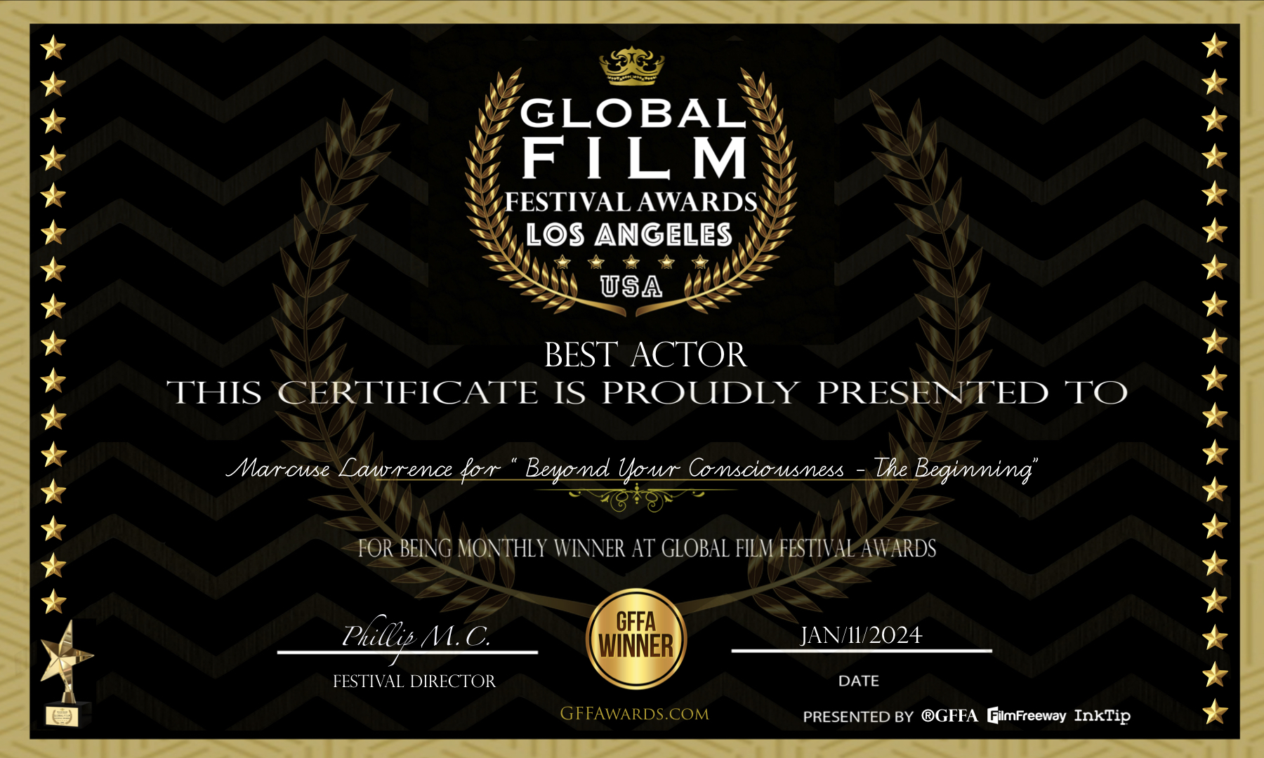 Marcuse Lawrence, from Beyond Your Consciousness – The Beginning, was awarded Best Actor at the Global Film Festival Awards, Los Angeles, USA.