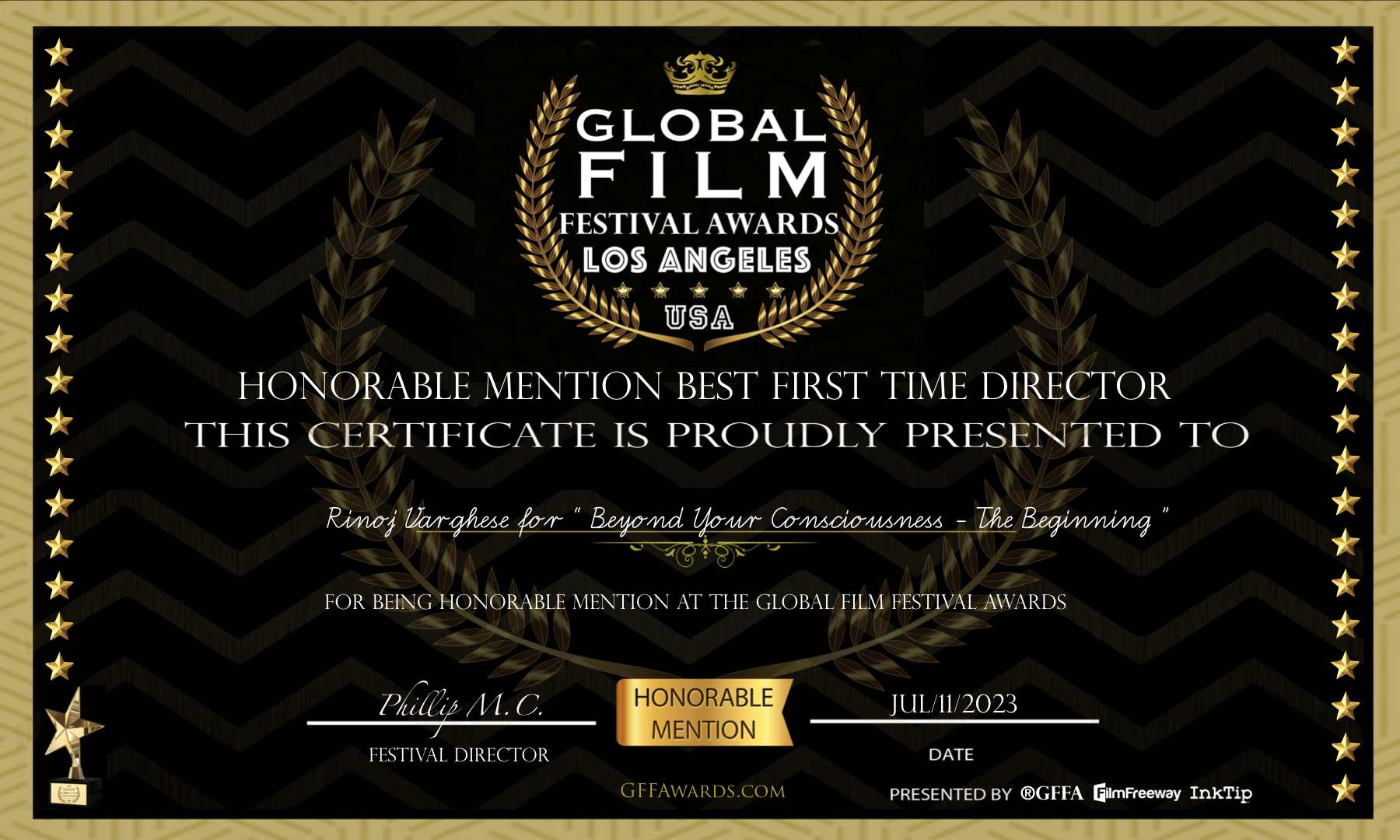 Beyond Your Consciousness – The Beginning received an Honorable Mention for Best First-Time Director at the Global Film Festival Awards, Los Angeles, USA.